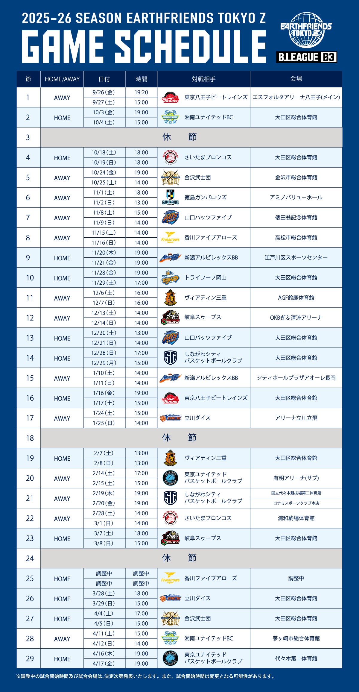 日程は予定であり、ホーム・アウェーともに変更となる可能性がございます。